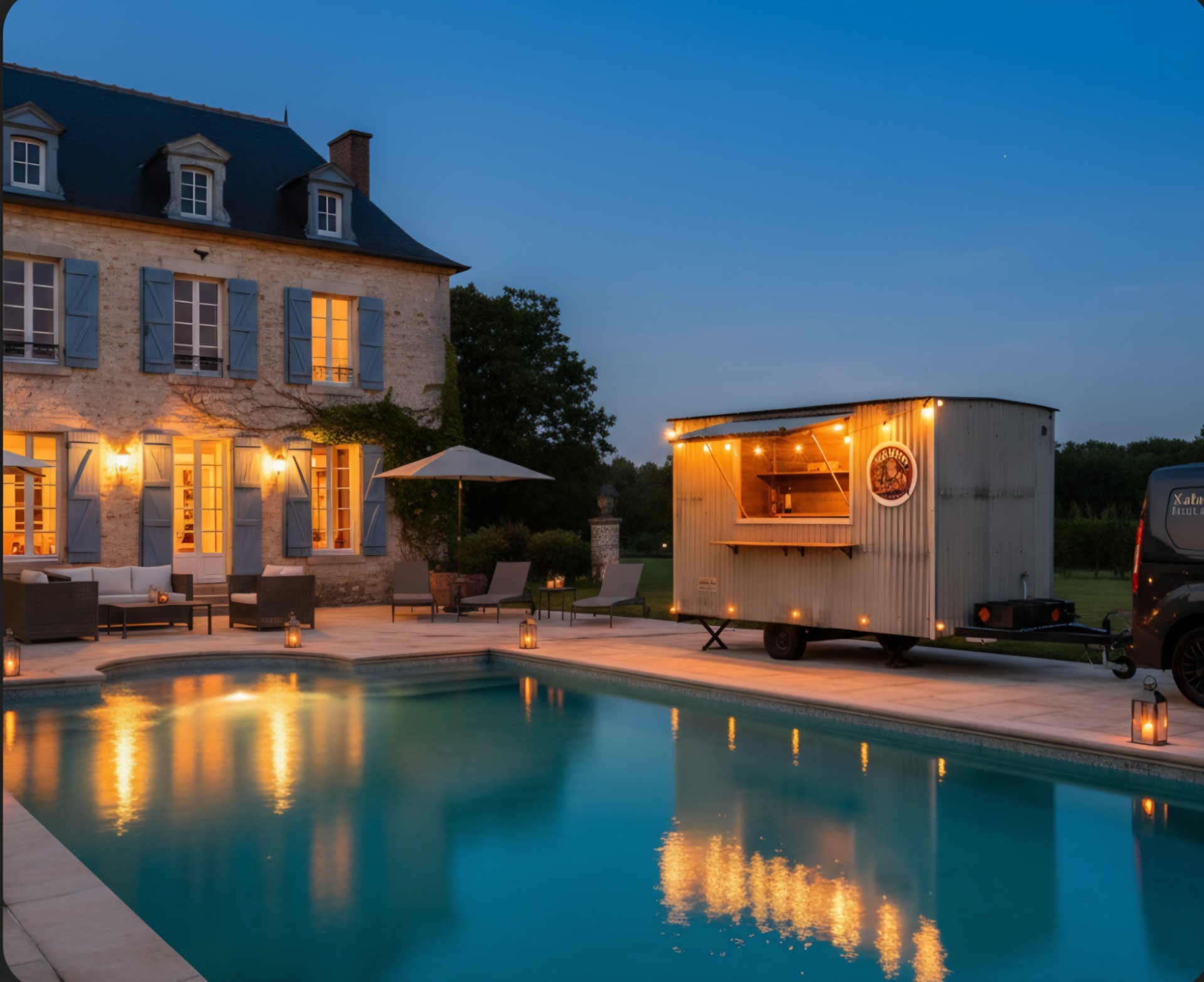 Onze Xalambo/Rent-a-Bar is uitgerust met 4 frigo's, warm en koud water, afvoer naar buiten, glazen of bekers, chromecast op tv met eigen wifi, 2 Dolce Gusto koffie apparaten, Led verlichting onder de bar.